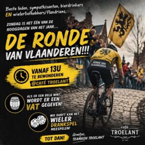 Beste leden, sympathisanten, bierdrinkers EN wielerliefhebbers/flandriens,Zondag is het een van de hoogdagen van het jaar.DE RONDE VAN VLAANDEREN!!!! Vanaf 13u te bewonderen @café Troelant. Als er een Belg wint, wordt er een vat gegeven! Wie durft kan het wieler drankspel meespelen?Tot dan! Groetjes,Teamken Troelant